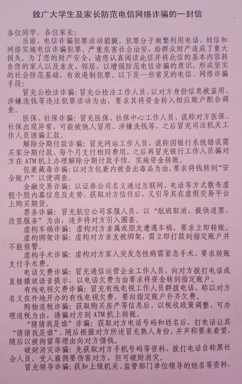 致广大学生及家长防范电信网络诈骗的一封信