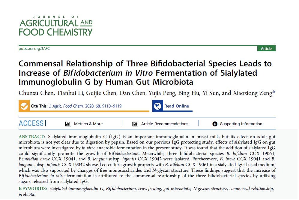 近日,我校食品工程学院青年教师陈春旭以第一作者在美国化学学会期刊《Journal of Agricultural and Food Chemistry》最新一期(2020, Volume 66, Issue 34)发表论文《Commensal Relationship of Three Bifidobacterial Species Leads to Increase ofBifidobacterium in Vitro Fermentation of Sialylated Immunoglobulin G by Human Gut Microbiota》。(原文发表网址https://dx.doi.org/10.1021/acs.jafc.0c03628)。
