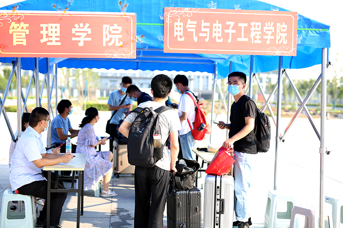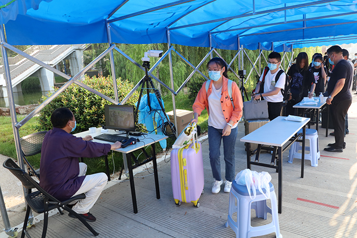 8月29日起,我校龙湖校区、凤阳校区将迎来秋季学期12067名学生返校。29日上午,笔者在两校区学生返校现场看到,返校第一天学校秩序井然,在返校专用通道,测量体温、更换口罩、手部消毒、查验安康码等环节井然有序地进行。“丹桂飘香 热烈欢迎广大同学平安返校”,校园内主干道横幅悬挂,氛围热烈,安静了几个月的校园瞬间热闹起来,蓬勃朝气伴随着同学们的平安归来瞬间充满了整个校园。