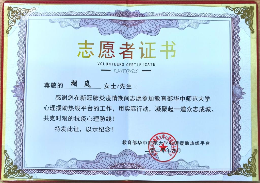 今年3月至5月,胡岚志愿参加教育部组织的武汉市华中师范大学心理援助热线平台的工作,线上为武汉市医务工作者、患者和家属、市民提供心理危机援助工作,主动接受教育部组织的线上心理危机干预技能专题培训和专业督导,并根据平台统一安排圆满完成疫情期间热线心理援助任务,为“共克时艰、加油武汉”贡献了安科人的一份力量。(特约通讯员:石志成 审核:何永勇 编辑:汤帅)