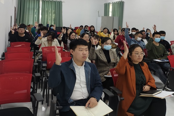 张聪指出,《习近平谈治国理政》第四卷集中展现了马克思主义中国化的最新成果,充分体现了我们党为推动构建人类命运共同体、共建美好世界作出的最新贡献,是全面系统反映习近平新时代中国特色社会主义思想的权威著作。《关于改革创新高校共青团工作切实加强思想政治引领实效的若干措施》文件的出台是深入贯彻落实习近平总书记关于共青团在高校学生思想政治工作中要发挥主力军作用的重要要求,对坚持党的全面领导,积极构建党委领导下团组织主导的高校团学组织体系,强化团组织思想政治引领,推动团组织深度融入“大思政”工作体系,在“三全育人”工作格局中充分发挥作用具有重要指导意义。团学干部要坚持读原著学原文悟原理,做到学而信学而悟学而行,在学懂弄通做实上下功夫,不断提高政治判断力、政治领悟力、政治执行力,切实把学习成果转化为奋进新征程、建功新时代的工作举措和实际成效。要深刻领会文件精神,结合学校现代化全国一流应用型大学建设,在“大思政”工作体系和“三全育人”工作格局中找准定位,切实肩负起团组织的政治责任,不断提高共青团思想政治引领工作的时代性、针对性、有效性,扎实形成共青团思想政治引领工作新格局、新机制、新成效。