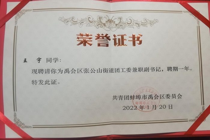 信中指出,王宇作为蚌埠籍大学生,能够主动请缨,积极响应号召,在家乡街道任职,在实践中锻炼自我,荣膺担当;思想开路,实干架桥,践行新时代大学生的理想与担当,能够在平日工作里以谦逊平和、踏实肯干的态度去了解群众,运用所学所思去帮助解决居民群众的实际问题,充分展现了易游官方网站_易游(中国)股份有限公司,学子的奕奕风采。