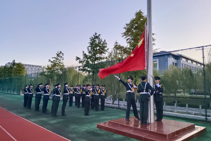 国旗护卫队队员身姿挺拔,精神饱满,迈着整齐有力的步伐,护卫着鲜艳的五星红旗走向升旗台。“升国旗,奏唱国歌!”全场肃然起敬,全体师生唱响雄壮有力的国歌,在歌声的回荡中表达出真挚而坚定的信仰,注视着红旗迎着朝阳,冉冉升起在蓝天白云中,随风飘扬。