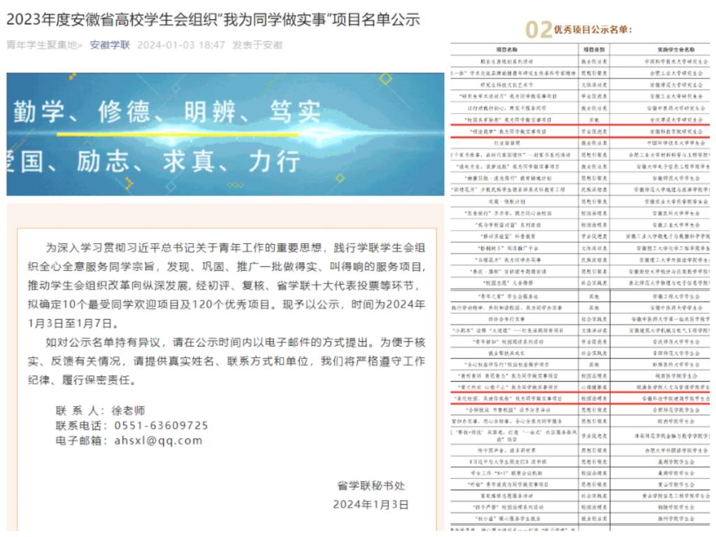 1月3日,安徽省学联公布2023年度安徽省高校学生会组织“我为同学做实事”项目名单,我校研究生会“研途筑梦”项目和建筑学院学生会“美化校园,共助你我他” 项目,经过初评、复核、省学联十大代表投票等环节脱颖而出,荣获2023年度安徽省高校学生会组织“我为同学做实事”优秀项目称号。