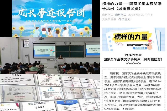 榜样的力量是无穷的,资助工作要充分发挥“指挥棒”作用,挖掘育人潜能,助力学生成长成才。2023年我校为3768名获得国家奖学金、国家励志奖学金、学校优秀学生奖学金的本科学生,发放奖金585.63万元;开展“皖美未来”,选树励志成才示范榜样和资助育人优秀典型;举办优秀学生表彰大会,鼓励安科学子向身边的青年榜样看齐;制作“成长事迹报告团”系列集锦视频,充分运用媒体手段,强化榜样正态引领效能。学院结合党团建设,开展优秀集体与个人先进事迹分享,举办“国奖经验交流会”,将良好经验交流融合在班团会议、支部组织生活、考研工作动员大会等活动中,协同推进朋辈示范引领,以广大学子喜闻乐见的方式开展交流,既严肃又活泼,倾听身边榜样的故事,切实提升了优秀学生良好经验分享的亲和力感染力共情力。
