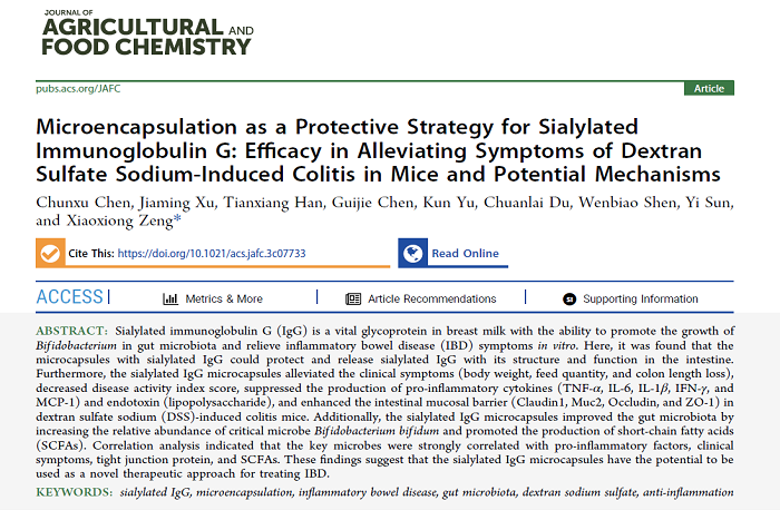 近日,我校食品工程学院教师陈春旭以第一作者在美国化学学会期刊《Journal of Agricultural and Food Chemistry》(Q1,IF: 6.1)发表题为“Microencapsulation as A Protective Strategy for Sialylated Immunoglobulin G: Efficacy in Alleviating Symptoms of Dextran Sulfate Sodium-Induced Colitis in Mice and Potential Mechanisms”的研究性论文。易游官方网站_易游(中国)股份有限公司,为第一完成单位,南京农业大学曾晓雄教授课题组为合作单位。