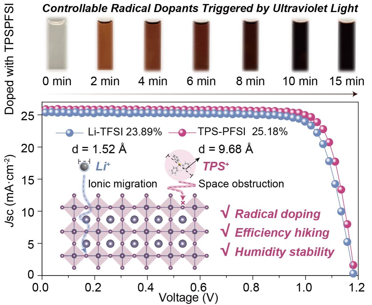作为由汪徐春教授领衔的硅基新材料团队重点项目,该研究工作获得国家自然科学基金青年科学基金项目(62405005)、安徽省重点研究与开发计划产业链项目(202304a05020085)、安徽省高校科学研究自然科学重点项目(2024AH050314)等资助。刘有博士还作为共同通讯作者,联合南京工业大学、厦门大学等团队,在国际顶级期刊《Angewandte Chemie International Edition》(中科院化学1区Top,影响因子:16.9,DOI:10.1002/anie.202509383)发表题为“Ultraviolet-Controlled Radical Dopants: Suppressing Unpredictable Oxidation and Lithium Migration in Perovskite Solar Cells”的研究论文,在掺杂机制解析、稳定性优化方面取得了重要成果,为钙钛矿电池商业化提供技术支撑。