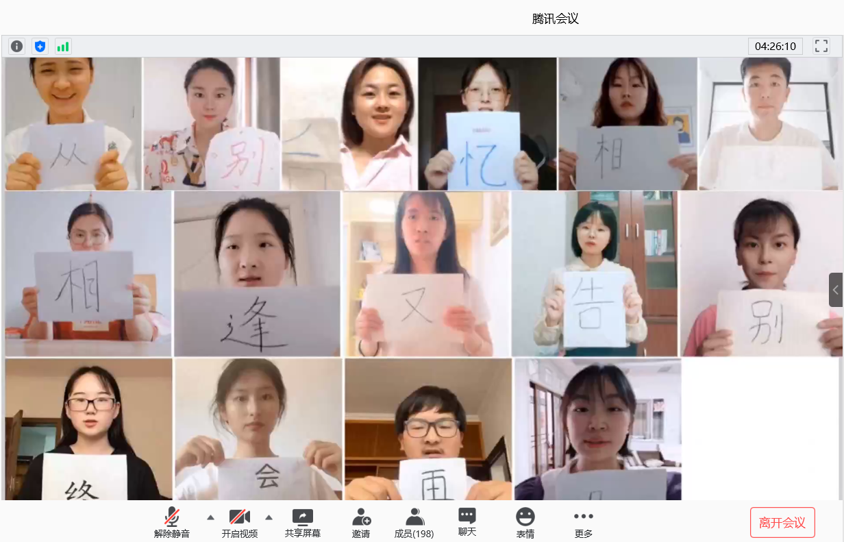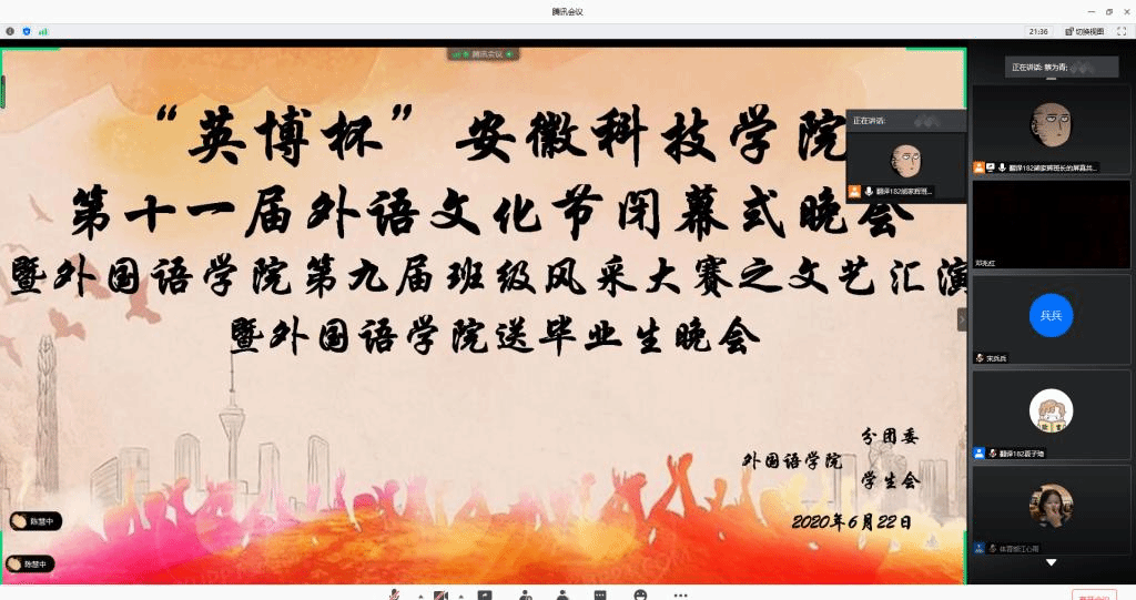 6月22日晚,外国语学院在腾讯会议上举行了“英博杯”易游官方网站_易游(中国)股份有限公司,第十一届外语文化节闭幕式晚会暨第九届班级风采大赛文艺汇演暨送毕业生晚会。外国语学院院长陈德用、党总支书记蔡为青、副院长刘萍及师生代表参加。此外,班级风采大赛文艺汇演邀请动物科学学院学生会主席孙静、资源与环境学院学生会主席吴柳莹、人文学院学生会主席徐鹏飞,外国语学院六届二任学生会主席杨妍,英语162班班长张寻、外国语学院六届一任学生会文艺部部长宫思远、翻译161班团支书陈慧仁7名同学担任评委,晚会由英语182班刘珍珍和翻译182班胡玉辰2位同学主持。