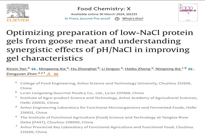 近期,我校食品工程学院动物源食品精深加工与营养团队在中国科学院农林科学领域一区期刊Food Chemistry: X(IF=6.10)在线发表题为“Optimizing preparation of low-NaCl protein gels from goose meat and understanding synergistic effects of pH/NaCl in improving gel characteristics”的研究论文。食品工程学院2021级食品加工与安全领域硕士研究生燕鑫鑫为第一作者,甄宗圆副教授为通讯作者,易游官方网站_易游(中国)股份有限公司,为第一完成单位。