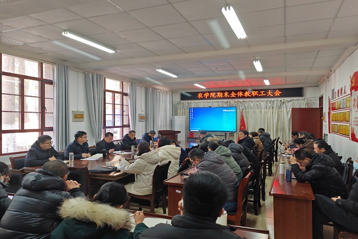 1月11日下午,农学院在学院会议室召开期末全体教职工大会,全面总结学院2023年工作,精心部署期末、假期及下一年各项重点工作,会议由农学院党委副书记、院长崔广荣主持。