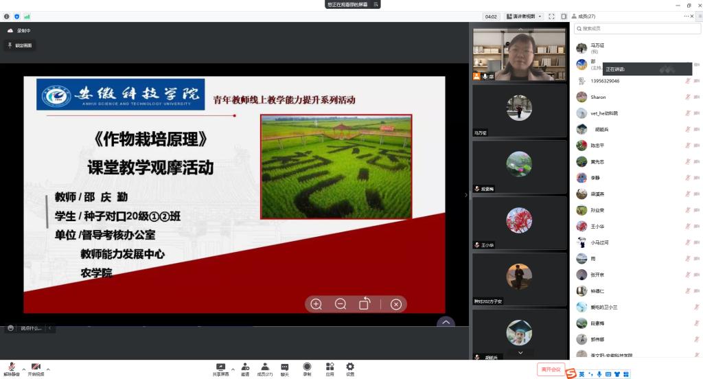 为促进青年教师线上教学水平提升,结合当前疫情防控要求,4月1日下午,农学院组织开展线上教学示范观摩课活动,农学系邵庆勤副教授通过学习通APP+腾讯会议平台为全院教师做了一堂精彩的线上教学示范课。督导考核办公室主任程斌、副主任王培章,农学院党委书记何世潮、副院长舒英杰及近三年新进教师和部分老教师参加了凤阳校区的线下观摩,部分在蚌埠的老师参加了线上观摩。
