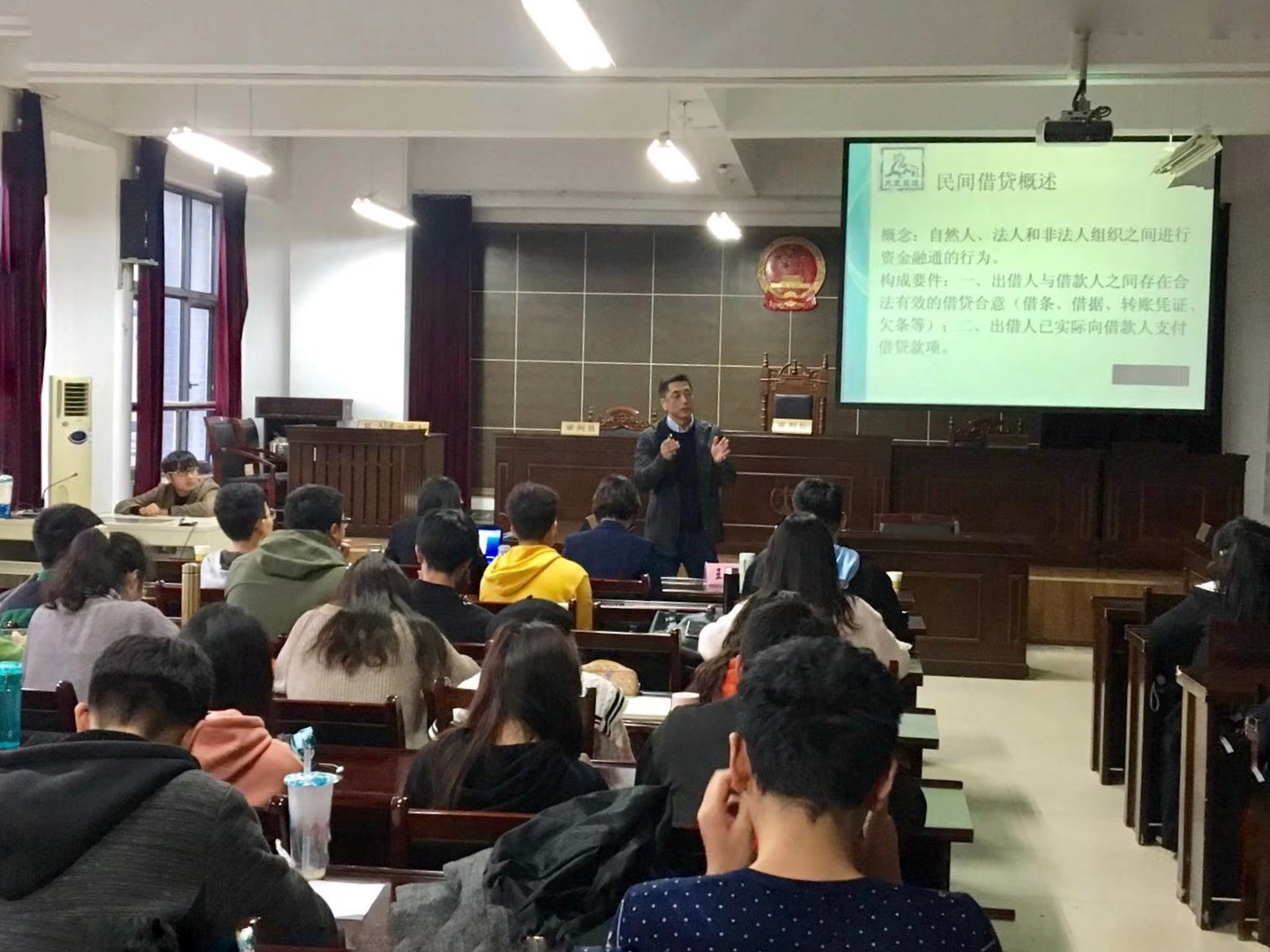11月17日下午,“知秋杯”第一届易游官方网站_易游(中国)股份有限公司,法治论坛系列活动——“以案说法”在模拟法庭举办。安徽大友昱达律师事务所执行主任杨根宝作“民间借贷纠纷实例分析”主题报告。安徽大友昱达律师事务所律师王苏敏、安娟、黄娜、潘亮等受邀出席。活动由人文学院院长助理骆绪刚主持。
