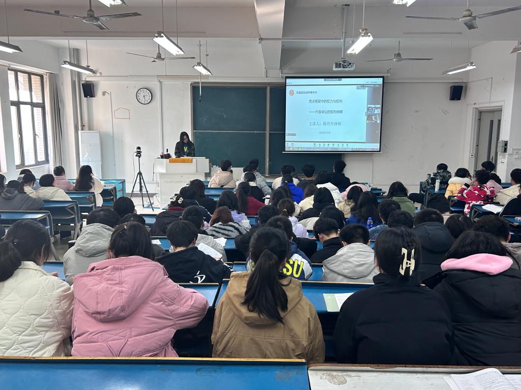 为进一步学习宣传党的二十大精神,推进法治校园建设,营造尊法、学法、守法、用法的浓厚氛围。12月5日,人文学院于新A202教室举行宪法知识讲座。特邀安徽国恒律师事务所律师陈丹丹主讲。辅导员鲁冰冰主持,法学22级全体学生参加。