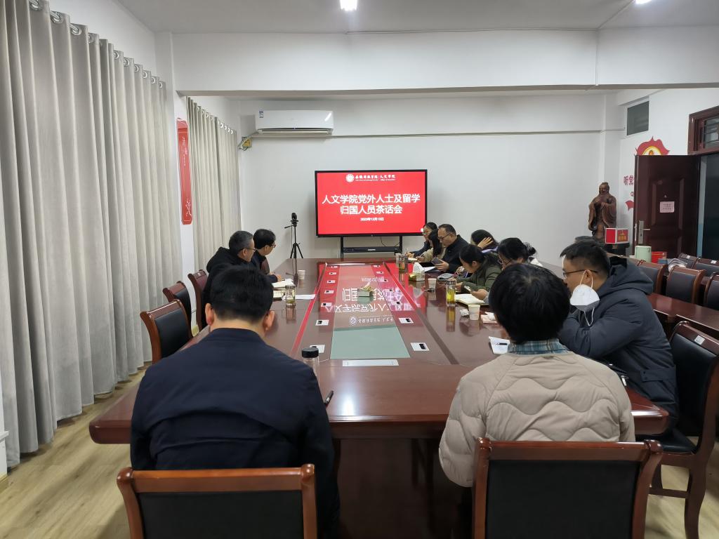 为深入学习贯彻习近平新时代中国特色社会主义思想,团结凝聚党外知识分子和留学归国人员力量,持续推进学院各项重点工作,2023年12月13日下午,人文学院在学知楼324会议室召开党外人士和留学归国人员茶话会。学院党政领导、党外人士和留学归国人员、教工党支部书记、党政办负责人和教学秘书参加,茶话会由正处级组织员张严政主持。