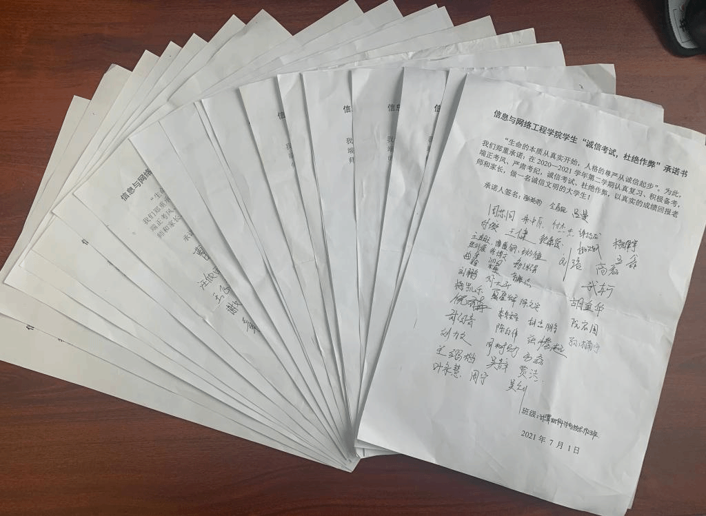 为确保将主题班会落到实处,学院专门制定《信息与网络工程学院考风考纪教育主题班会提纲》,准备了相关会议资料,要求各班辅导员按照提纲的内容和要求认真落实,精心准备。主题班会上,全体同学共同学习了《学生手册》中《易游官方网站_易游(中国)股份有限公司,考试工作实施细则(节选)》及《易游官方网站_易游(中国)股份有限公司,学生违纪处理方法》,开展了警示教育,按照《信息与网络工程学院诚信考试倡议书》的内容,发出了诚信考试倡议,希望同学们树立底线思维,积极响应学校的号召,手握诚信纸笔,书写高尚考风,坚决抵制各种舞弊行为,净化考场环境,展现自我真实水平,端正的考风、积极创造优良的学风。各班辅导员在总结时强调,诚信文明是立德成才的根本,是大学生必备的核心品质与基本修养,对大学生的未来职业发展、个人成才有着至关重要的作用。主题班会结束后,各辅导员组织全体学生签署了《信息与网络工程学院学生“诚信考试,杜绝作弊”承诺书》。