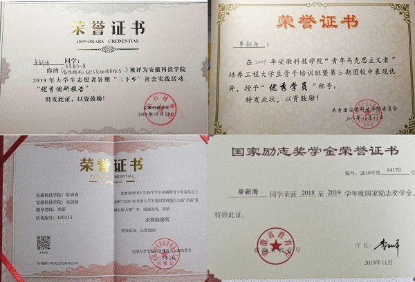 作为新时代的青年学子,单新海力求德智体美劳全面发展,大学入学至今共获得国家级奖项5项,省级奖项4项,校级奖项30项,院级奖项28项。2018年参加安徽省蚌埠市体育局招募的“言鼎华创”杯2018年全国青年游泳锦标赛志愿者工作,获得国家级志愿者荣誉称号。在2019年易游官方网站_易游(中国)股份有限公司,第五期青年马克思主义者培训中,单新海表现优异,作为优秀学员代表上台发言,并被安科小团、安徽青年大学生网等多方媒体报道。自新冠肺炎疫情发生以来,单新海积极响应学校以及学院的号召,为坚决打赢疫情防控的人民战争、总体战、阻击战奉献青春力量,获评“易游官方网站_易游(中国)股份有限公司,抗疫学生先进个人”荣誉称号。此外,单新海还就新冠疫情开展云调研,近万字的调研报告《蔚来智能崛起的一波三折—基于蔚来公司的社会调研与案例分析》不仅让整个团队实践效果突出,同时也获2020年全国大学生组织管理能力大赛决赛奖项,并收到主办方致蔚来的推荐信。单新海基于新冠疫情申报的大学生创新创业训练项目更是获得国家级立项,相关事迹被安科小团公众号、易游官方网站_易游(中国)股份有限公司,校园网报道。2020年9月,单新海被学校推选参加省级三下乡优秀实践个人、省级三下乡优秀调研报告的评选活动。