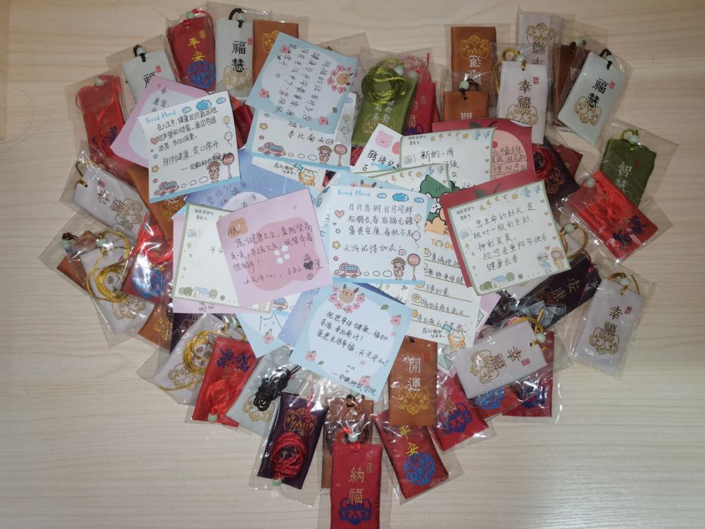 前期,志愿者们亲笔书写祝福话语,绘制美术作品,向为学校新校区建设默默付出的人们表达感激之情。活动现场,志愿者们亲手将装有祝福语的平安符送给学校工作人员,询问身体状况,倾听他们的心声,帮助一起打扫卫生,将浓浓的情感注入每位学校工作人员的心田。一位保洁阿姨说道:“你们一句温情问候,一份贴心礼物,让我们觉得很暖心。”