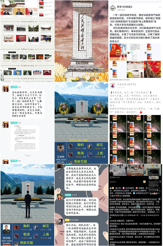 学院38个团支部陆续开展了“网上祭英烈”主题团日活动,各团支部认真学习了关于网上祭英烈的相关知识,并展开了相关讨论。多数班级以班群留言为形式,让同学们更好的说出心中所想;还有一部分班级在“守护2021清明祭英烈”敬献花篮。