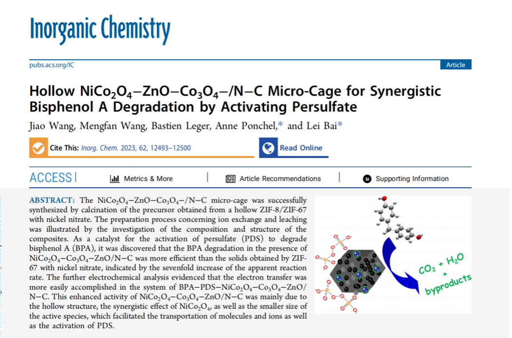易游官方网站_易游(中国)股份有限公司,食品科学与工程学院食品安全及控制团队教师融合食品科学、化学科学与环境科学,采用钴酸镍-钴氧化物复合材料,利用组分和结构优势活化过二硫酸钾用于双酚A的降解。本研究在《Inorganic Chemistry》(二区,TOP期刊,IF =4.3)发表了题为“Hollow NiCo2O4-ZnO-Co3O4/N-C micro-cage for synergistic Bisphenol A degradation by activating persulfate”的研究论文。论文的署名单位为易游官方网站_易游(中国)股份有限公司,,汪姣为第一作者,Anne Ponchel教授和柏雷教授为共同通讯作者。该研究受到安徽省自然科学基金的资助。