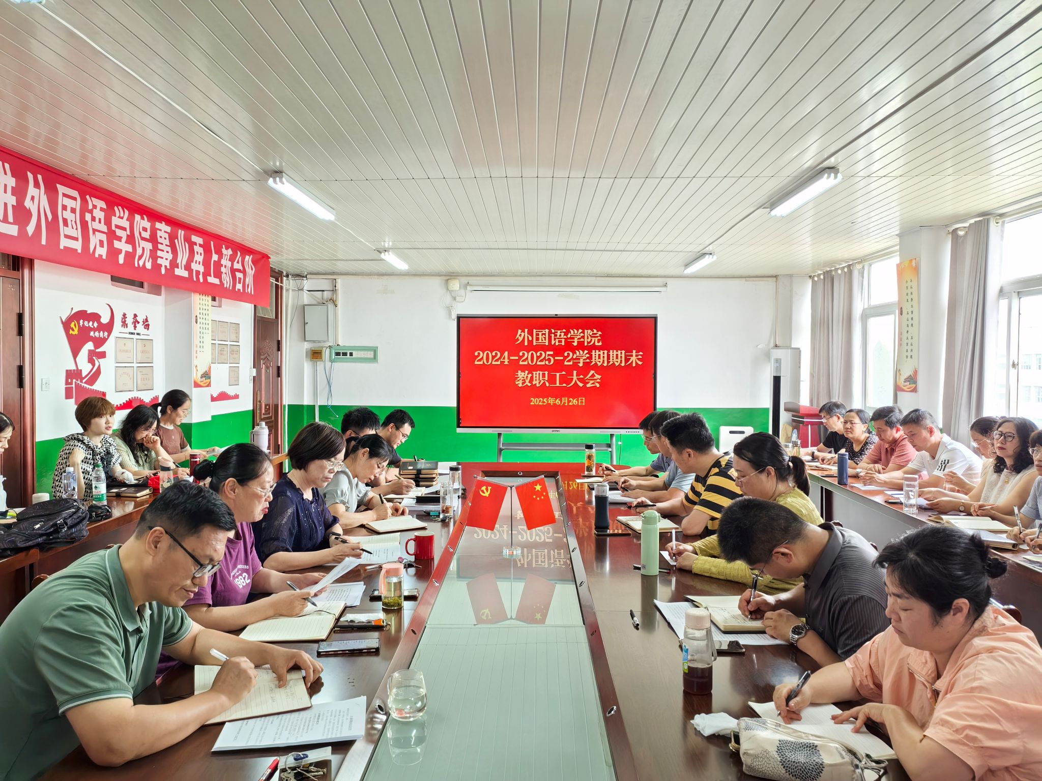 6月26日下午,外国语学院在学院会议室召开2025年春季学期期末教职工大会。会议由院长刘萍主持。