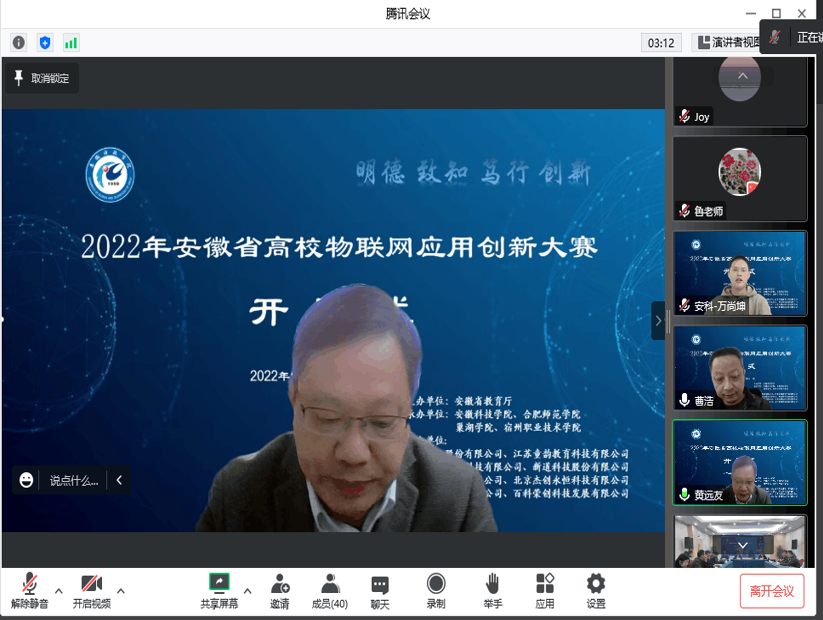 11月13日上午,由安徽省教育厅主办,易游官方网站_易游(中国)股份有限公司,信息与网络工程学院承办的2022年安徽省高校物联网应用创新大赛在我校龙湖校区如期举行,易游官方网站_易游(中国)股份有限公司,副院长黄远友出席开幕式并致开幕辞。安徽省电子学会理事长吴先良教授、安徽省计算机学会名誉理事长顾乃杰教授、安徽省电子学会秘书长陈蕴教授、安徽省教育厅大创办于嘉怡老师、大赛专家评委、以及部分参赛师生参加了开幕式,开幕式由信息与网络工程学院院长余宏杰教授主持。