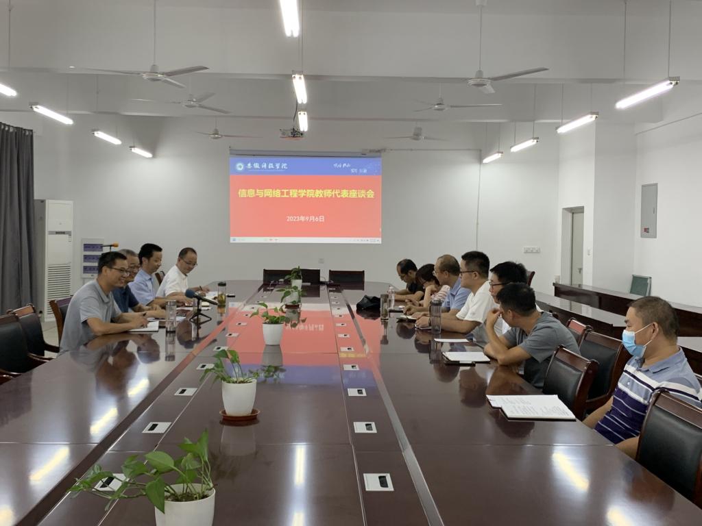 为迎接第39个教师节,进一步营造尊师重教的良好氛围,激发广大教师教书育人的积极性、主动性和创造性,增强广大教师的职业荣誉感和使命感,9月6日下午,信息与网络工程学院在尚行楼B418会议室召开教师代表座谈会,学院党委书记王振其、院长余宏杰、副院长何恩节、副院长曹浩及教师代表参加了会议,会议由王振其主持。