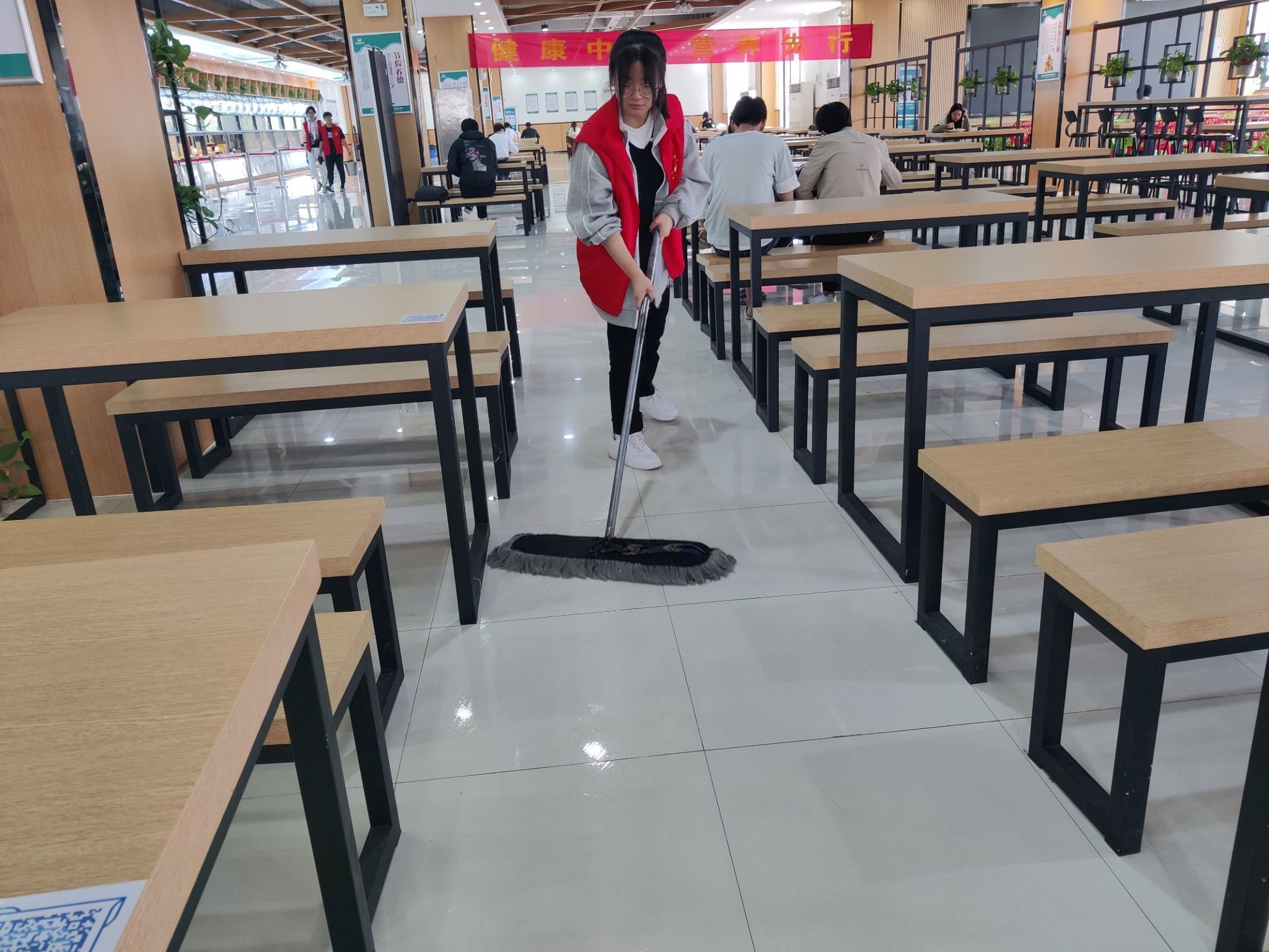 各班级根据前期工作区域划分,在课后各班级前往天鹅湖、金味祥源、红鹰等餐厅,并随着各班长的一声令下“大家行动起来吧!”,同学们纷纷拿起抹布,忙碌的身影穿梭在食堂桌台前、餐盘回收处以及走道等各个角落,用抹布认真着擦拭每一个桌椅,以实际行动助力校园就餐环境建设,以劳动践行个人价值。