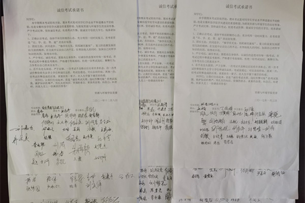 根据学院学生工作安排,组织各班级签订诚信考试承诺书,引导学生正确认识期末考试,保持平和而积极的心态,营造“比、学、赶、超”的良好氛围;严肃考纪,诚信考试,引导学生树立诚信意识,严格遵守考试纪律,营造“诚信考试光荣、违纪作弊可耻”的考试氛围;引导学生互帮互助,积极发扬团结互助的精神,组织学习兴趣小组、帮扶小组,在探讨交流中促进共同进步,营造“零挂科”班级氛围。